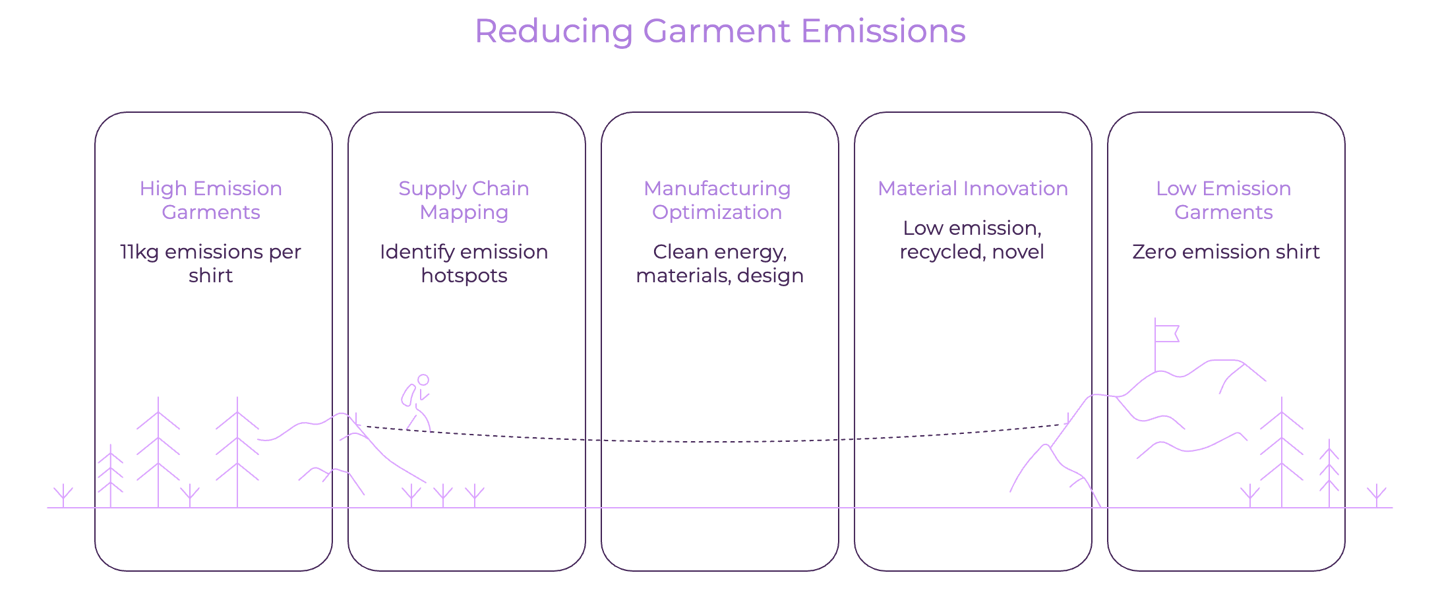 Once mapped, we will identify high-emission hotspots, set reduction targets & manage them by using environmental tracking tools (e.g., Higg Index)